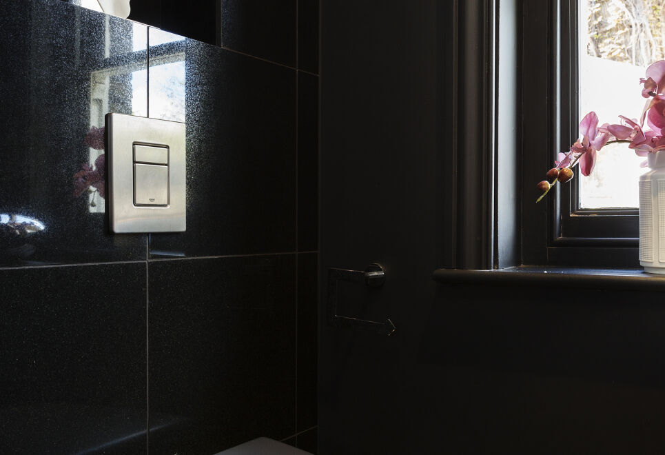 Opposite the principal suite is the guest bedroom, tastefully designed in earthy tones and equipped with a smart double bed and mirrored chest of drawers. It has the comfort of a stunning en-suite bathroom in marble, fitted with a modern bath and overhead shower. Quietly tucked away on the top floor, the two children’s bedrooms are both finished to an excellent standard with single beds (please note, one bed is a trundle bed). Sleek and contemporary with monochrome patterned walls, the top-floor bathroom is fitted with a full-size bath with overhead shower.