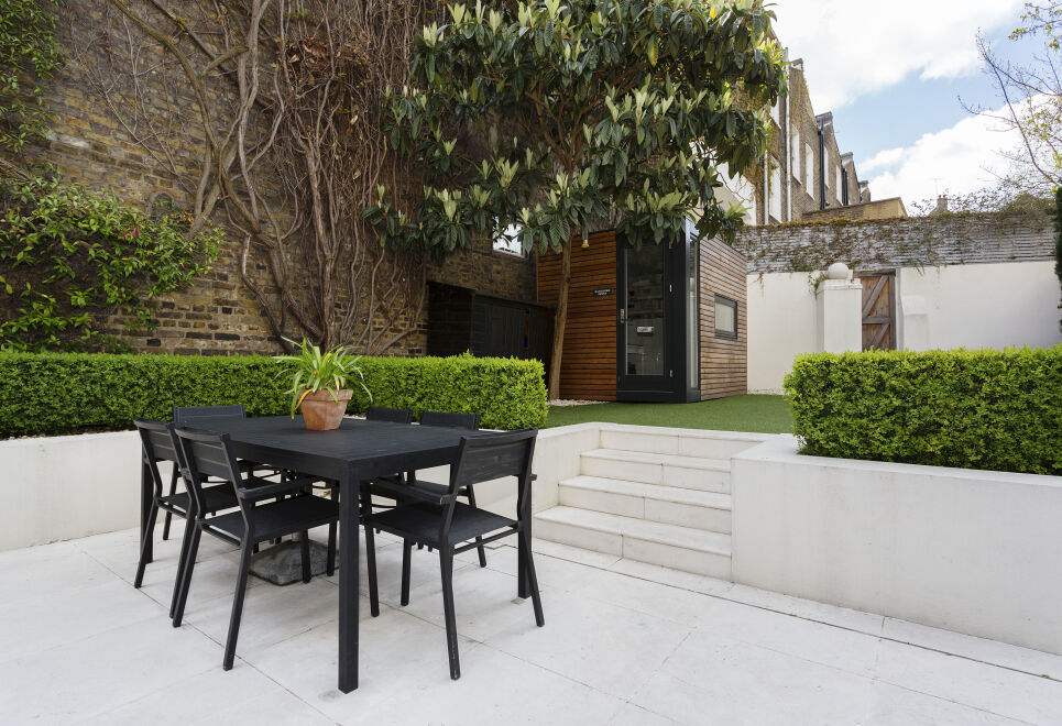 Fancy a quiet night in? Retire to the modern TV room, equipped with a large entertainment unit, flat-screen TV and a contemporary electric fireplace. From the TV room, guests can directly access the picturesque back garden, beautifully kept with a sophisticated seating area and manicured grass lawn lined with trimmed hedges. On the upper floor of the house is the stunning principal bedroom, contemporary in design and featuring mirrored wall panels and a modern electric fireplace, along with that sought-after extra luxury — air conditioning. Pared back in style, this peaceful room is equipped with a super king-sized bed, recliner armchair and soft carpeted floors. A large space with built-in wardrobes leads to the equally stunning en-suite bathroom. Its elegant design features a double wash basin and the comfort of both a walk-in shower and separate bath.